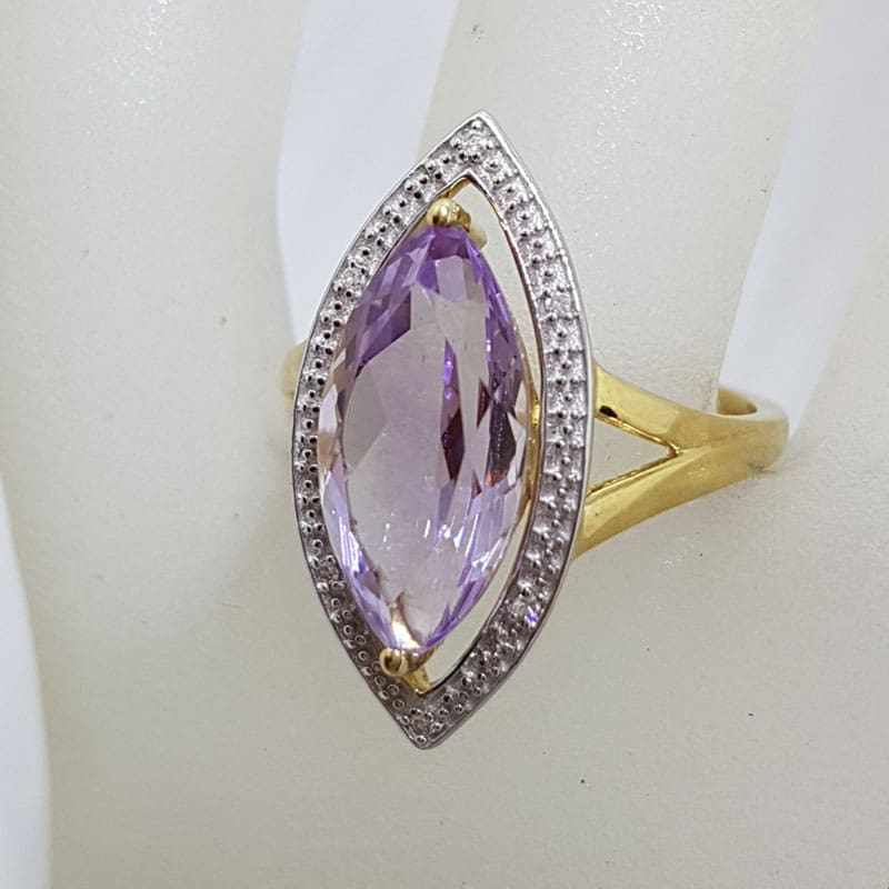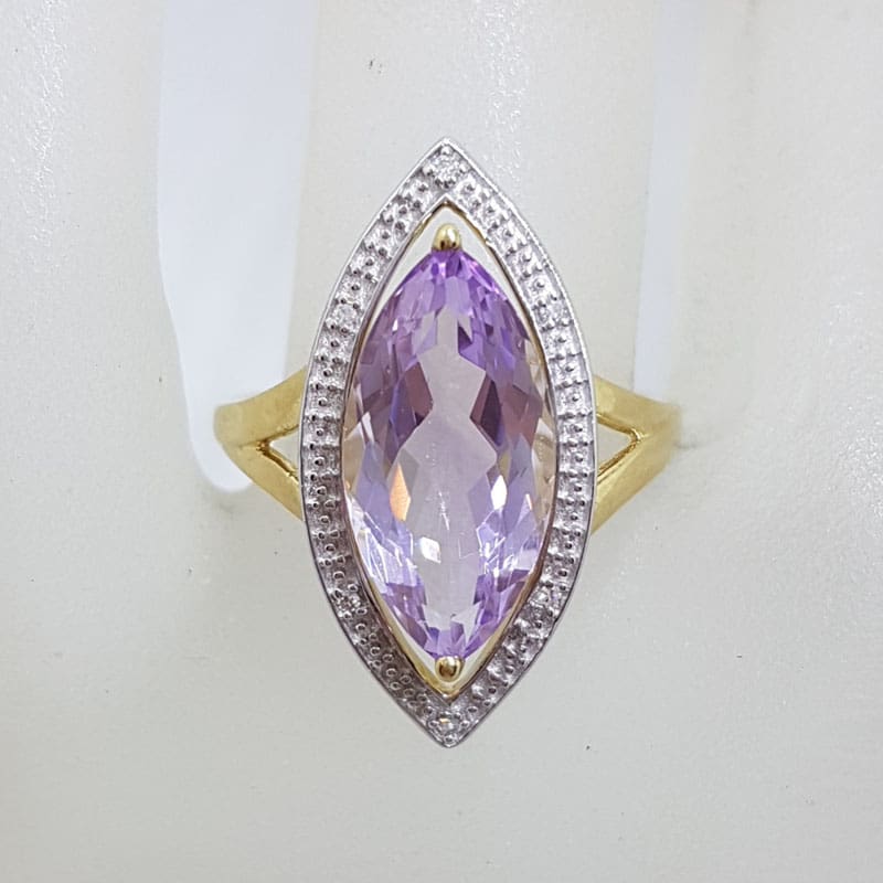 9ct Yellow Gold Large Amethyst and Diamond Marquis Shape Cluster Ring
