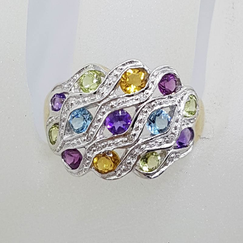 9ct Yellow Gold Multi-Coloured Gemstone Wide Ring – Citrine, Topaz, Peridot, Amethyst & Diamond