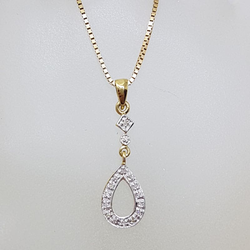9ct Yellow and White Gold – Two Tone – Diamond Teardrop / Pear Shape Pendant on Gold Chain