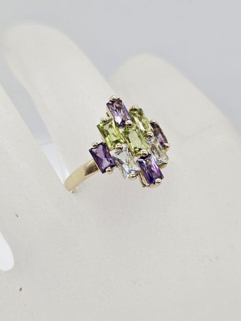 Tags: 9ct, amethyst, Cluster, Marquis, Multi-coloured, Peridot, Ring, Shape, topaz, Yellow Gold