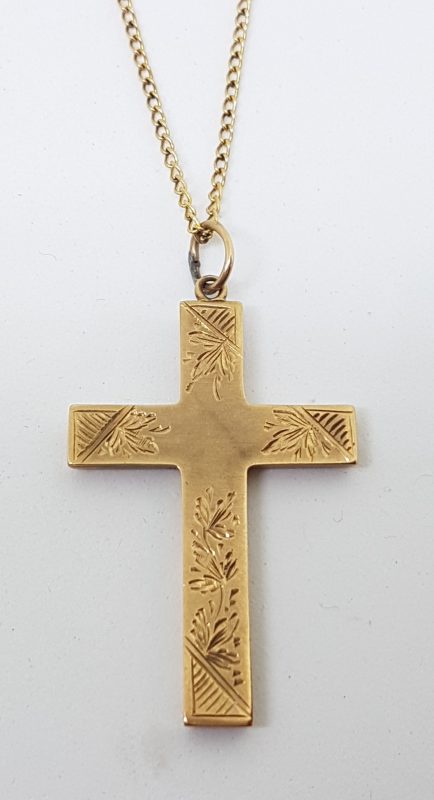 Tags: 9ct, Antique, Chain, Cross, Crucifix, Gold, Ornate, Pendant, Yellow Gold