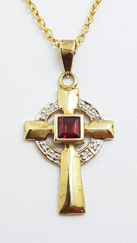 Tags: 9ct, 9ct Yellow Gold, Celtic, Chain, Cross, Crucifix, diamond, Garnet, Pendant