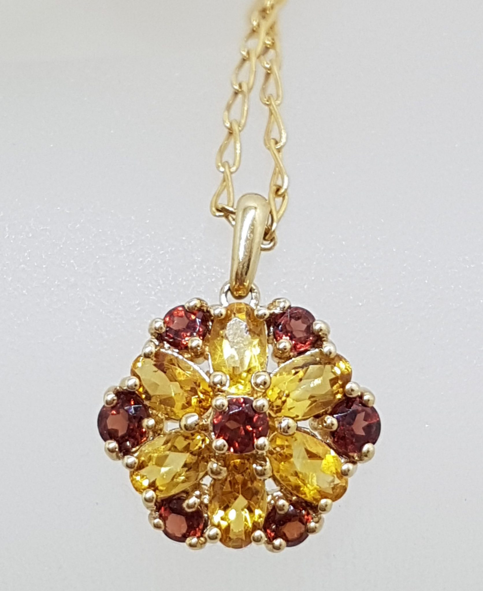 9ct Yellow Gold Garnet & Citrine Flower Cluster Pendant on Gold Chain
