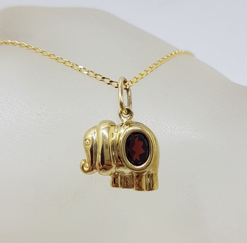 9ct Yellow Gold Garnet Elephant Pendant on Gold Chain