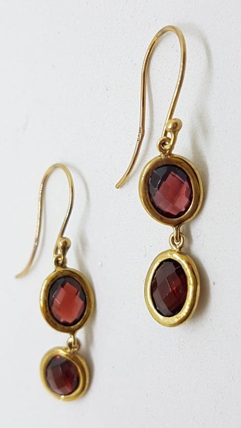 9ct Yellow Gold Long Oval Garnet Double Drop Earrings