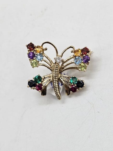 9ct Yellow Gold Multi-Coloured Gemstones Ornate Butterfly Brooch – Diamond, Amethyst, Topaz, Peridot, Citrine, Garnet, Ruby, Emerald and Sapphire