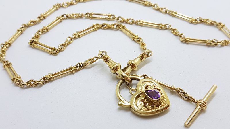 Tags: 9ct Yellow Gold, amethyst, Chain, Filigree, Heart, Necklace, Ornate, Padlock, T-Bar