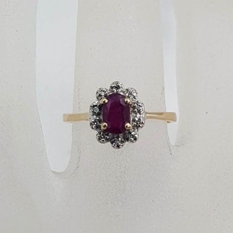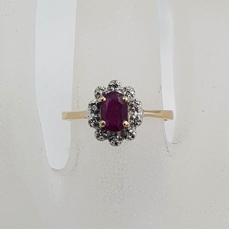 *SOLD* 9ct Yellow Gold Oval Natural Ruby Surrounded by Diamonds Oval Cluster Ring – Antique / Vintage