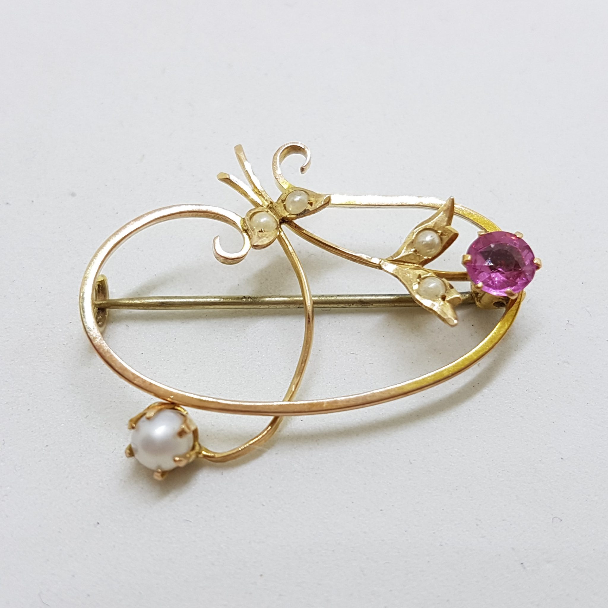 9ct Yellow Gold Oval Ornate Pink with Seed Pearl Brooch – Antique / Vintage