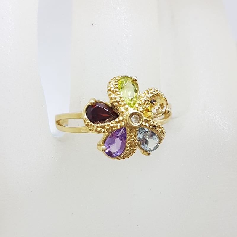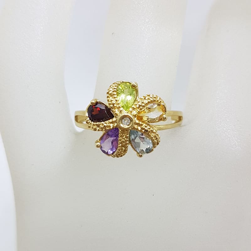 9ct Yellow Gold Peridot, Citrine, Topaz, Amethyst, Garnet & Diamond Flower Cluster Ring – Starfish
