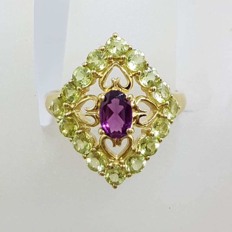 9ct Yellow Gold Peridot & Rhodolite Garnet Ornate Filigree Large Ring
