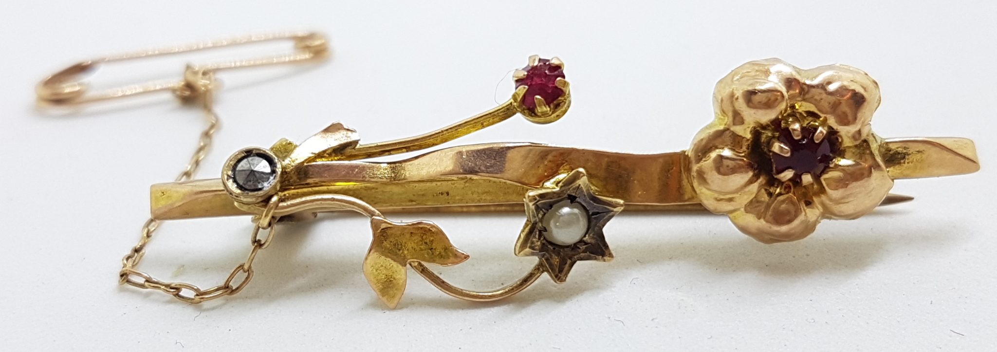 Tags: 9ct, Antique, Bar, Brooch, flower, Gold, Red, Seed Pearl, Seedpearl, vintage, Yellow