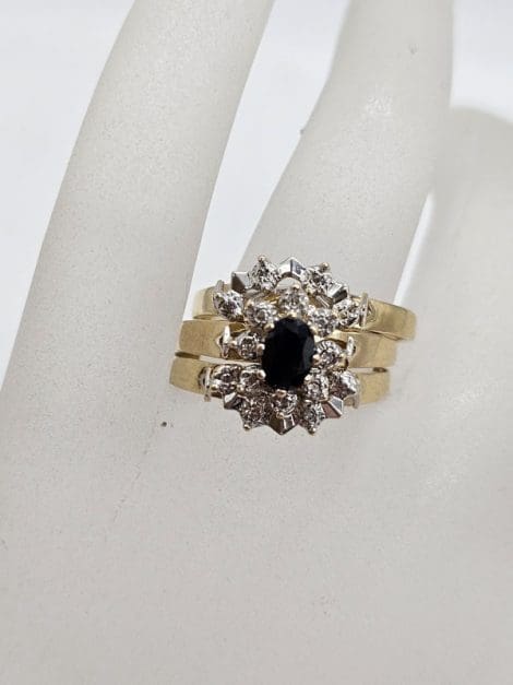 9ct Yellow Gold Sapphire and Diamond Oval Engagement Ring, Wedding Ring and Eternity Ring Set – Three Ring Set – Vintage