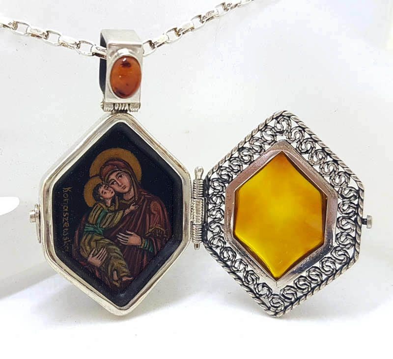 Exquisite Sterling Silver Amber Icon – Handpainted by Polish Artist under a Magnifying Glass – on Beautiful Long Sterling Silver Chain