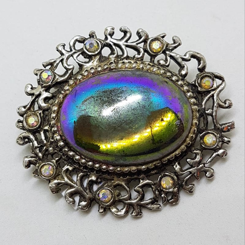 Oval Plated Aurora Borealis Oval Cluster Brooch – Vintage Costume Jewellery