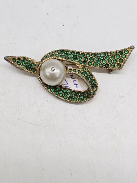 Plated Green Stones and Faux Pearl Large Swirl Brooch – Vintage Costume Jewellery