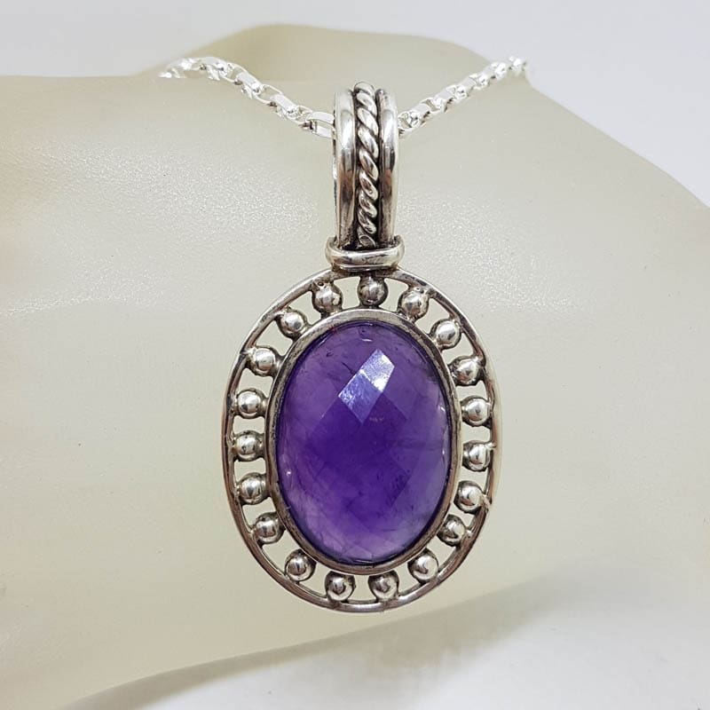 Sterling Silver Amethyst Faceted Oval in Ornate Rimmed Setting Pendant on Silver Chain