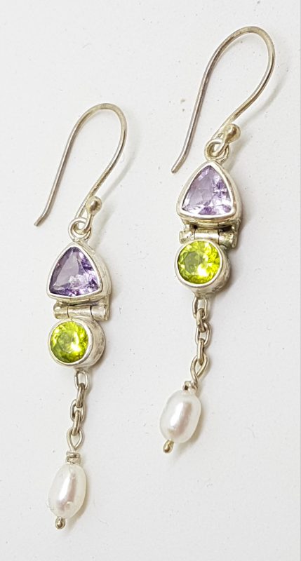 Sterling Silver Amethyst, Peridot & Pearl Long Earrings