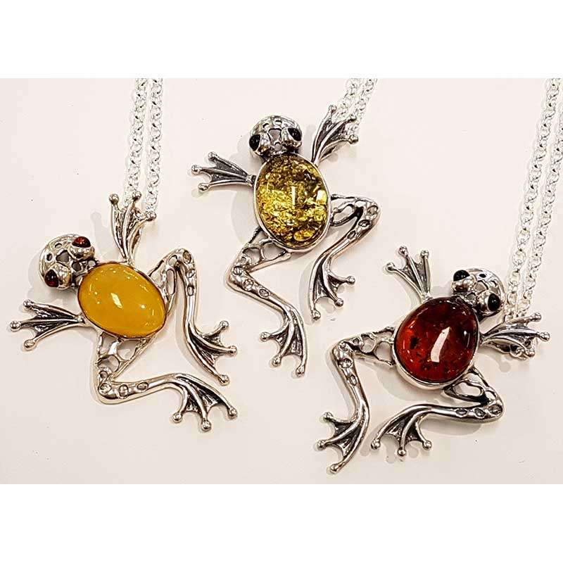 Sterling Silver Large Amber Frog Pendant on Chain – Available in Brown, Green and Butter Amber