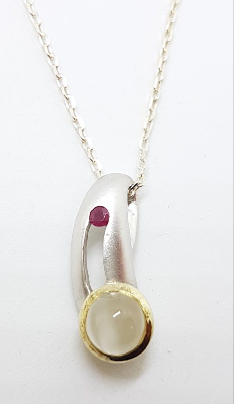 Sterling Silver & Gold Plated Matte Finish Moonstone & Ruby Pendant on Silver Chain