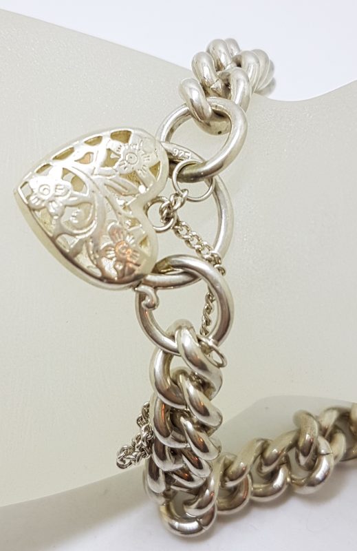 Sterling Silver Heavy Curb Link Filigree Padlock Bracelet