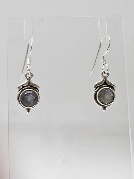 Sterling Silver Labradorite Dainty Round Bezel Set Drop Earrings