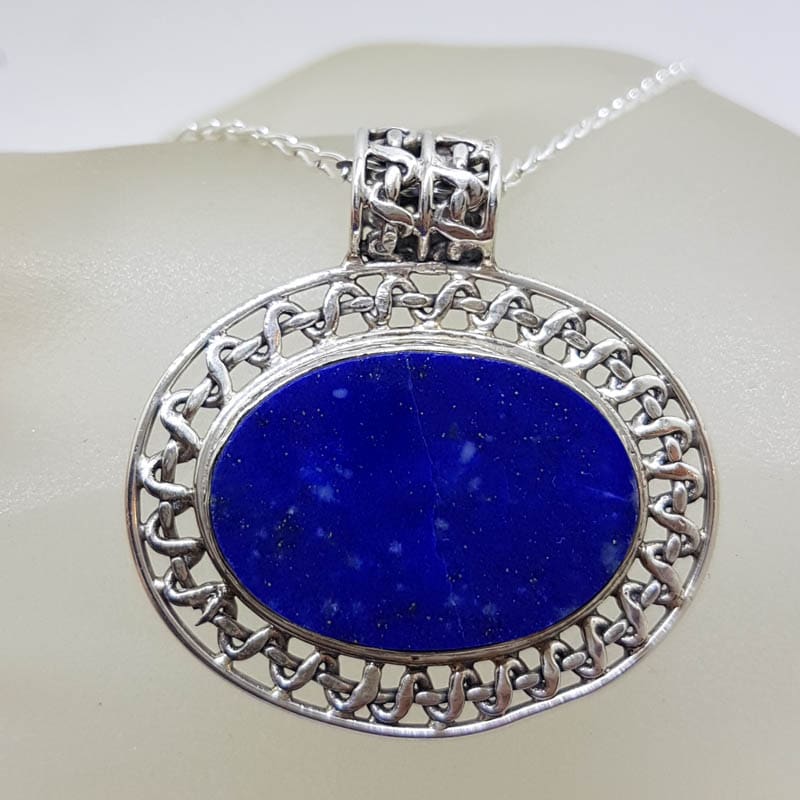 Sterling Silver Lapis Lazuli Large Oval with Ornate Rim Pendant on Silver Chain