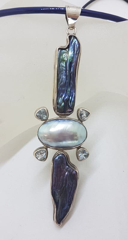 Sterling Silver Large & Long Blue / Grey Pearl and Topaz Pendant on Silver Enamel Choker Chain / Necklace