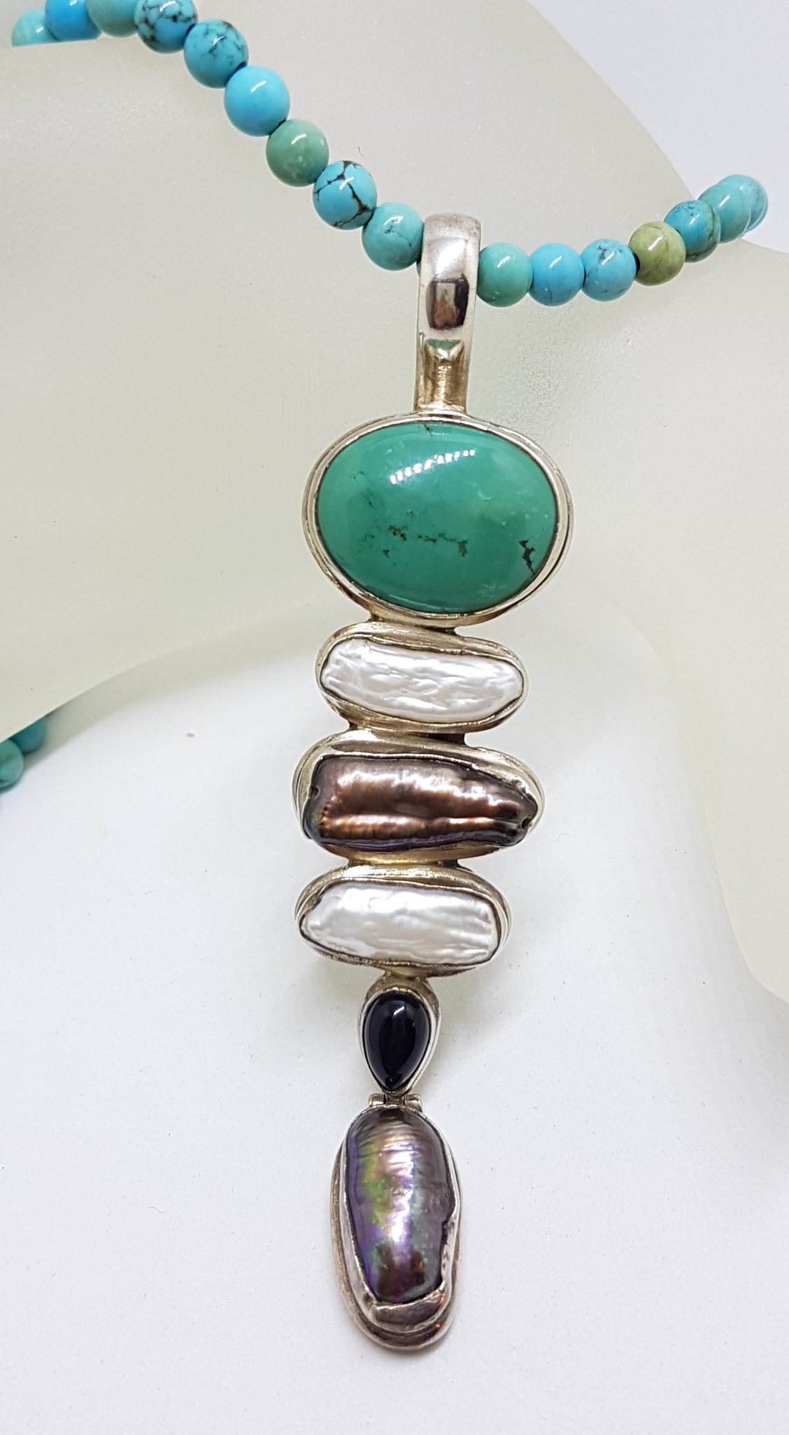 Sterling Silver Large & Long Turquoise, Blister Pearl and Onyx Pendant on Turquoise Bead Necklace / Chain