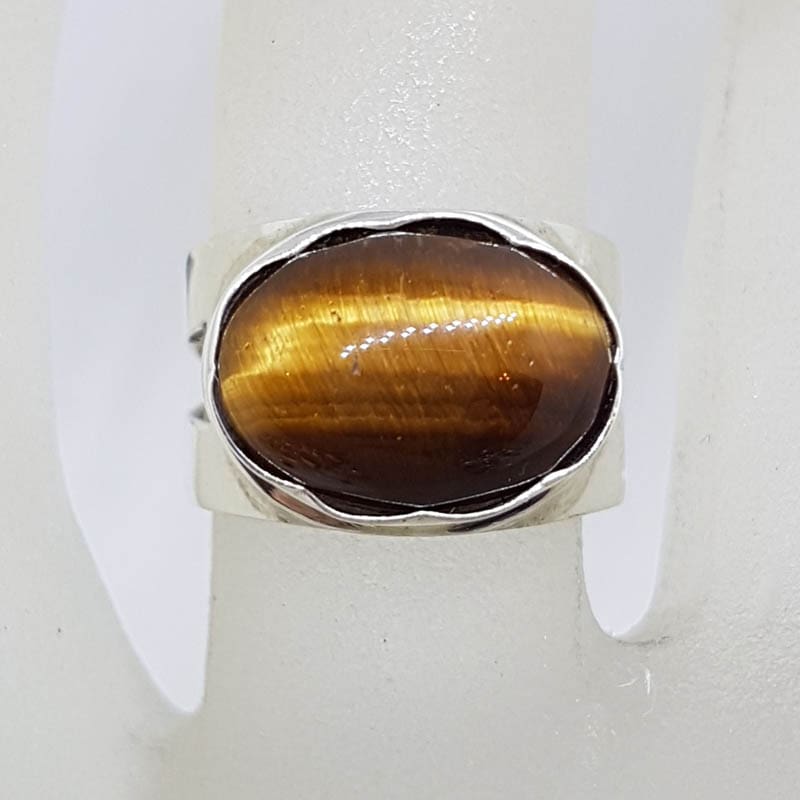 Sterling Silver Large Oval Tiger Eye on Wide Open Band Ring