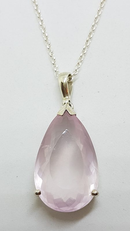 Sterling Silver Large Teardrop Shape Faceted Rose Quartz Pendant on Silver Chain