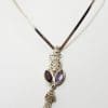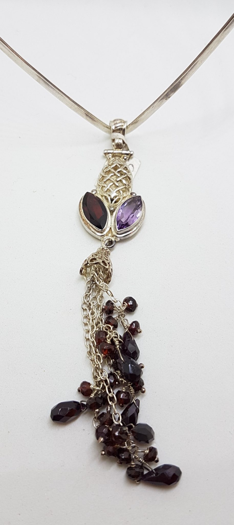 Sterling Silver Long Garnet and Amethyst Tassel Pendant on Choker Chain / Necklace