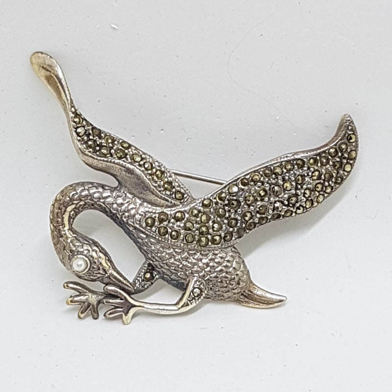 Sterling Silver Marcasite and Mother of Pearl Large Crane Bird Brooch