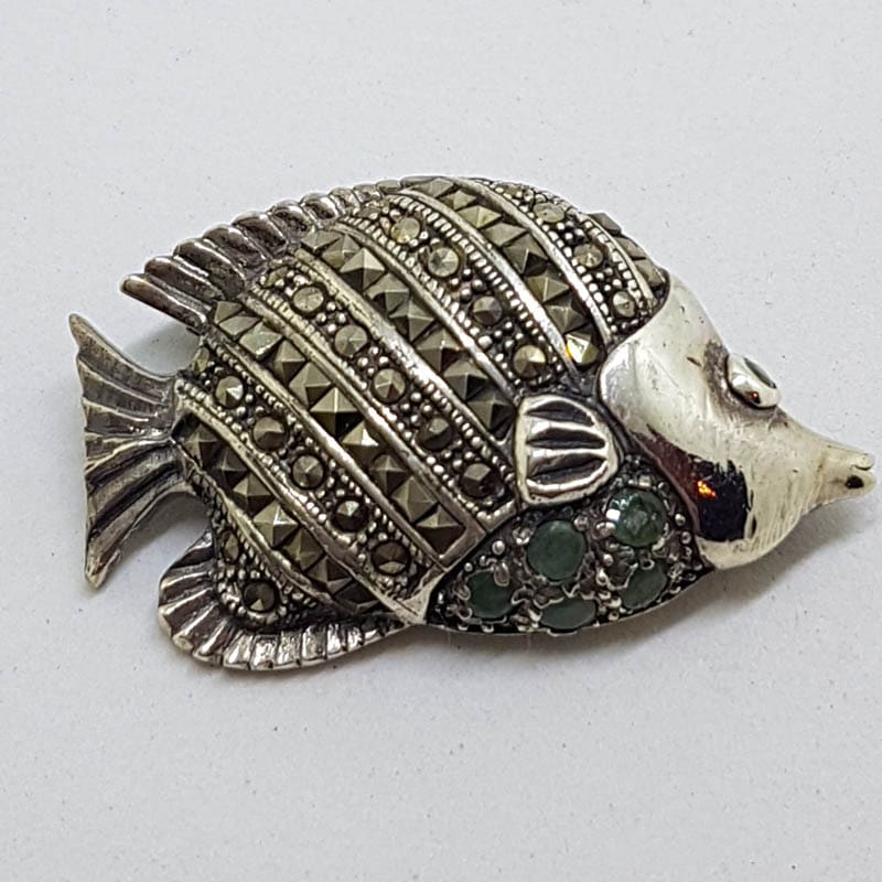 Sterling Silver Marcasite & Emerald Fish Brooch