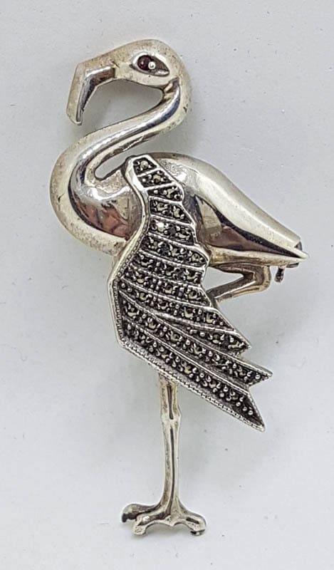 Sterling Silver Marcasite Flamingo / Heron / Bird Brooch with Garnet Eye