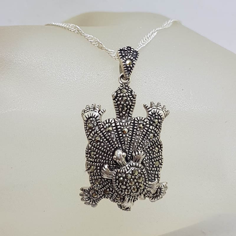 Sterling Silver Marcasite Mother and Baby Turtle Pendant on Sterling Silver Chain