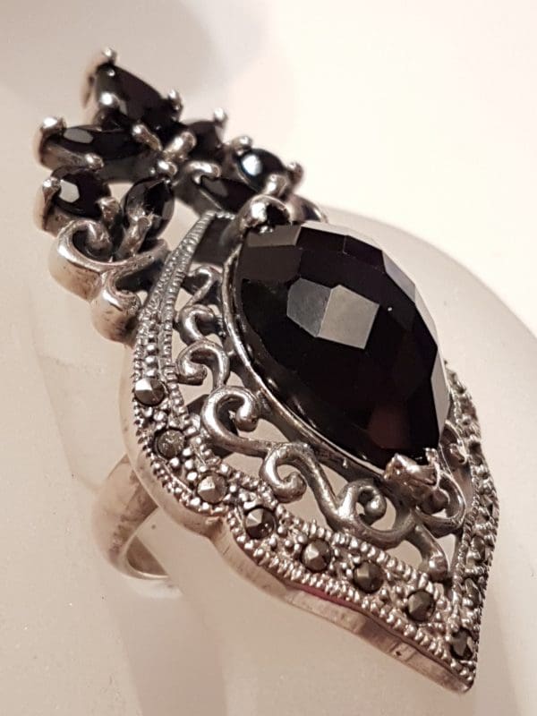Sterling Silver Marcasite Very Big / Long Onyx Ornate / Filigree Ring