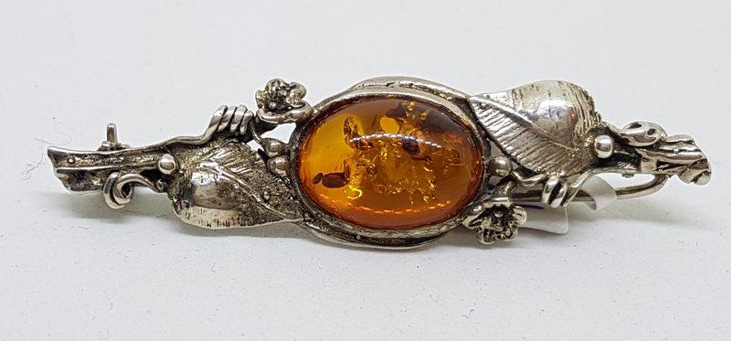 Sterling Silver Natural Amber Ornate Bar Brooch
