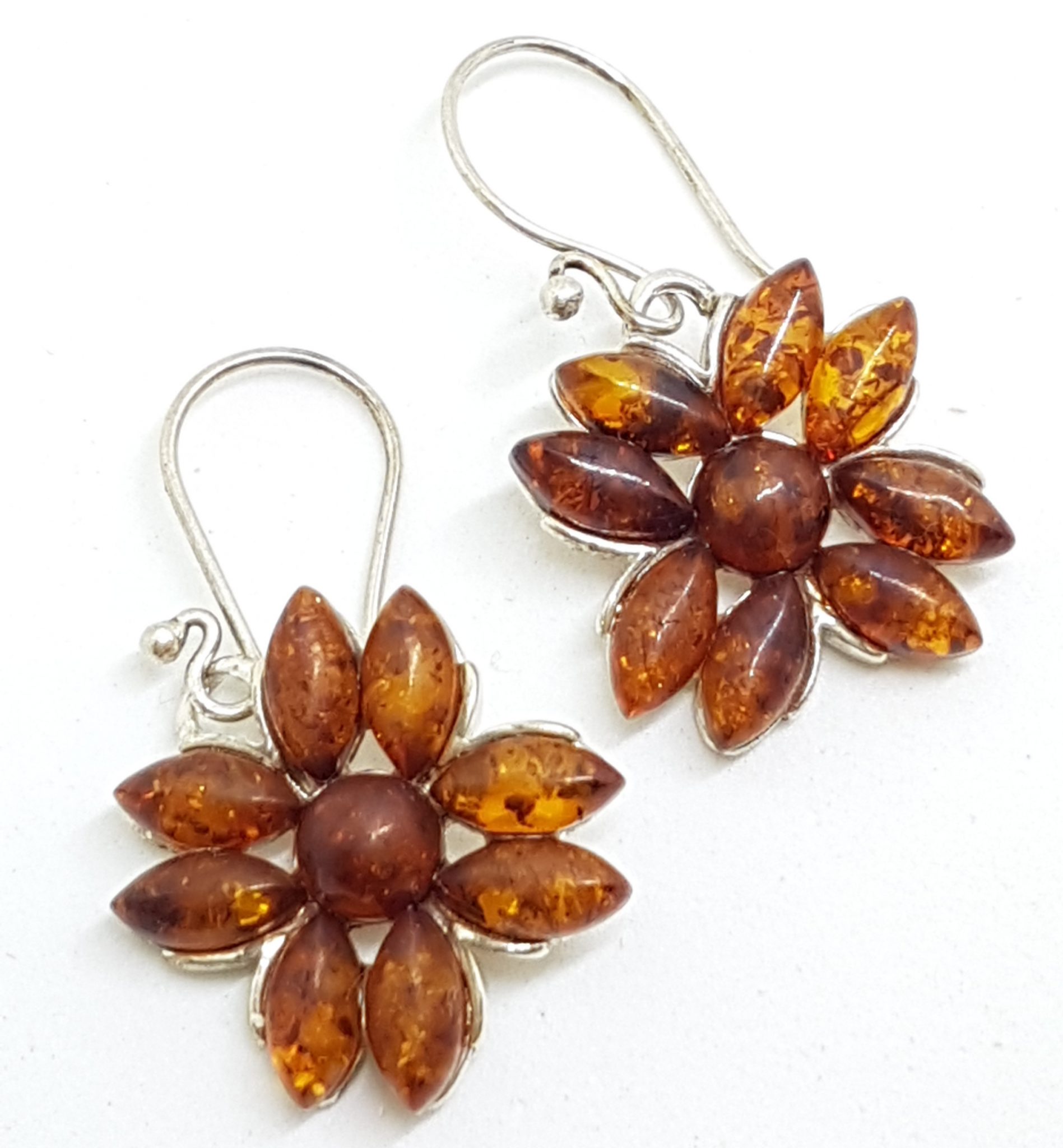 Sterling Silver Natural Baltic Amber Large Flower Cluster Drop Earrings