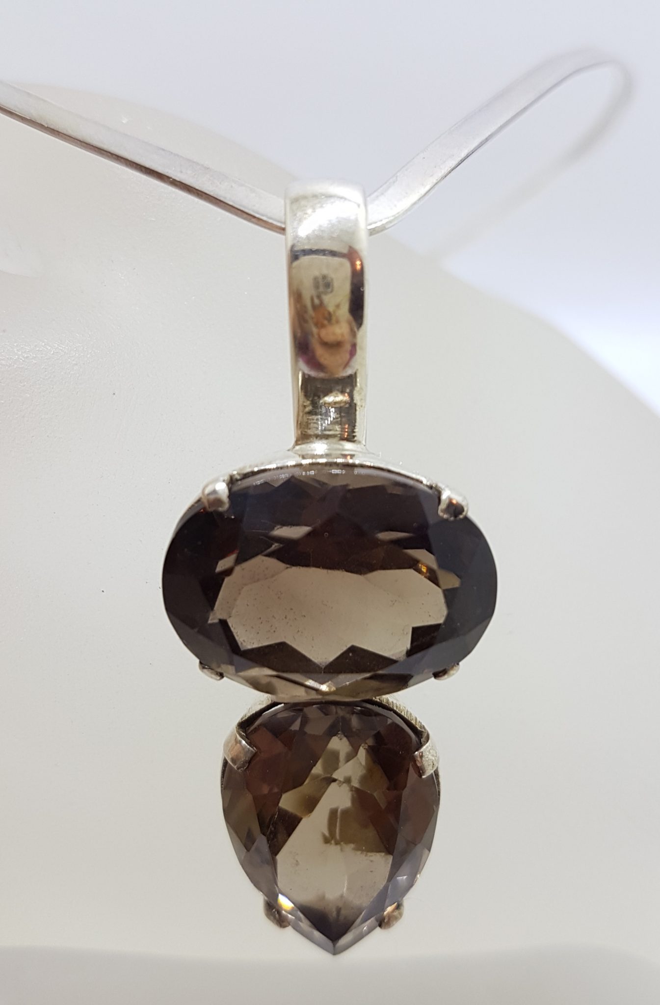 Sterling Silver Oval & Pear Shape / Teardrop Smokey Quartz Pendant on Silver Choker Chain / Necklace