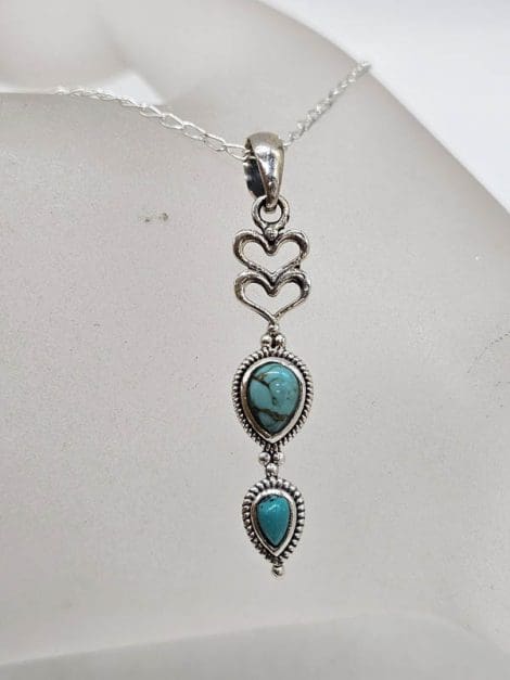 Sterling Silver Turquoise Ornate Elongated Heart Drop Pendant on Silver Chain