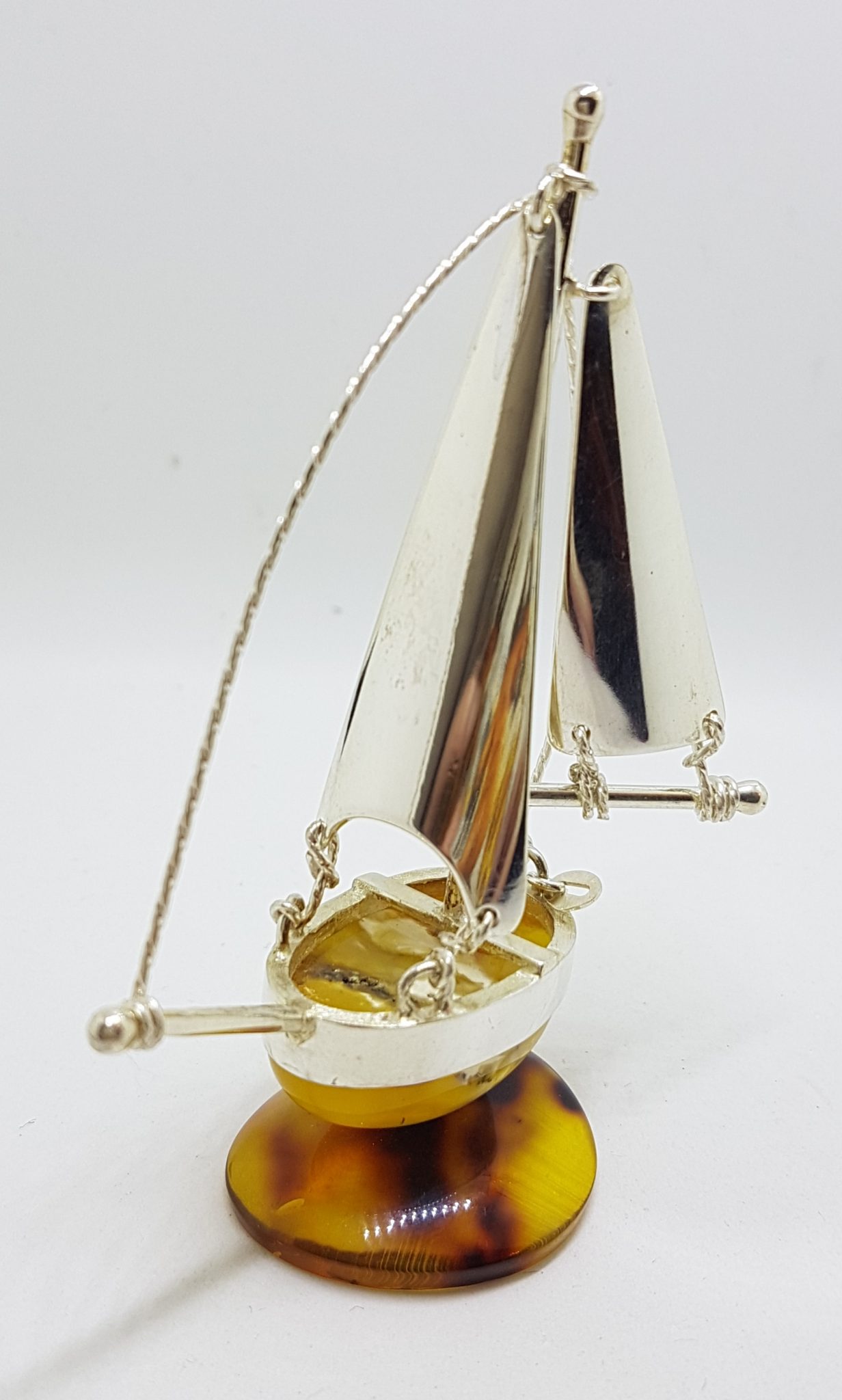 Tall Sailing Ship / Boat / Yacht – Solid Sterling Silver Natural Baltic Amber Figurine / Statue / Sculpture